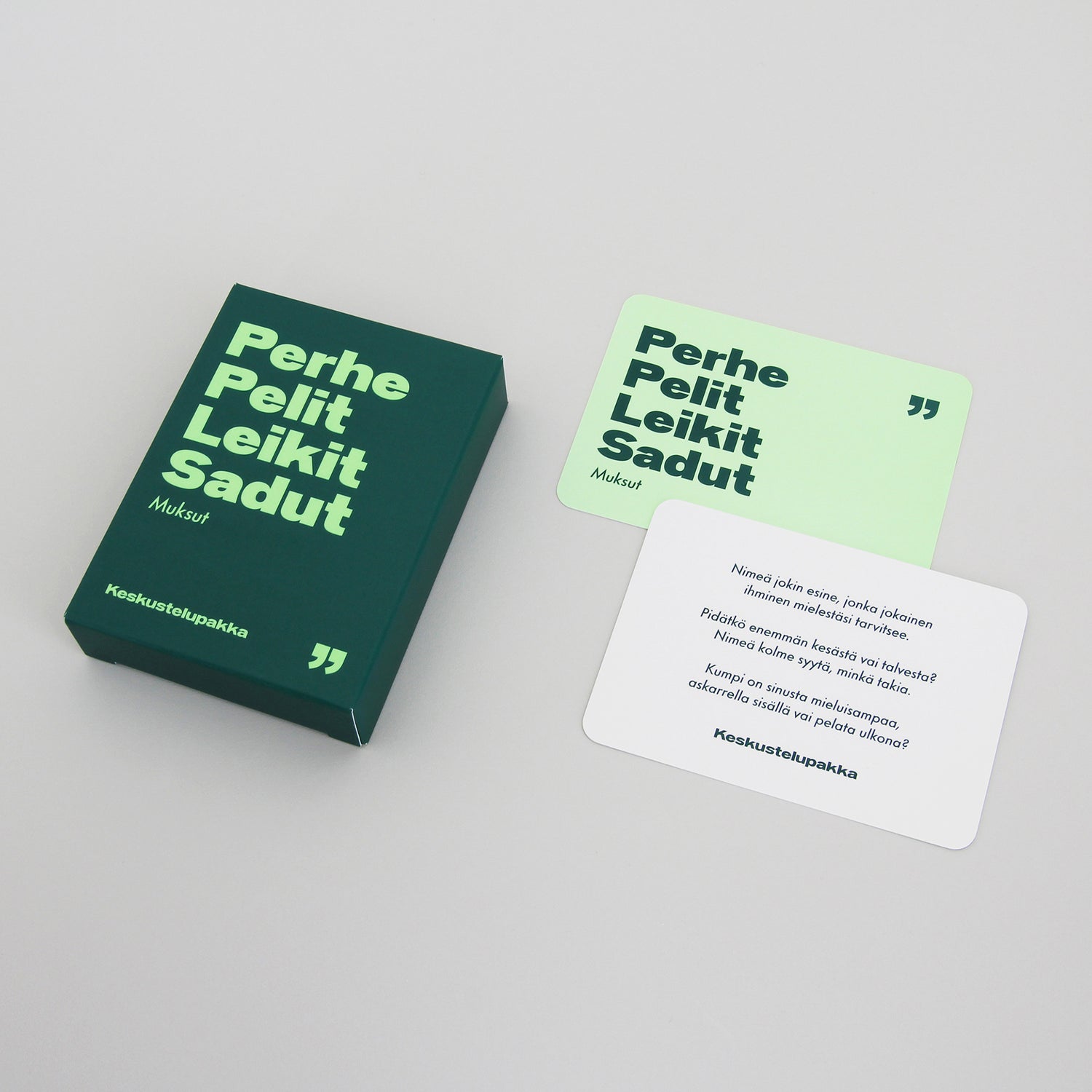 Haluatko luoda hauskoja hetkiä ja kuulla syvällisiä oivalluksia lasten kanssa? Keskustelupakka Muksut on suunniteltu juuri siihen: herättämään iloa, naurua ja aitoja keskusteluja. Tämä ainutlaatuinen lasten peli sisältää hauskoja, pohdituttavia ja luovia kysymyksiä, joiden avulla voit sukeltaa lapsen maailmaan ja tutustua hänen ajatuksiinsa ja kiinnostuksen kohteisiinsa.