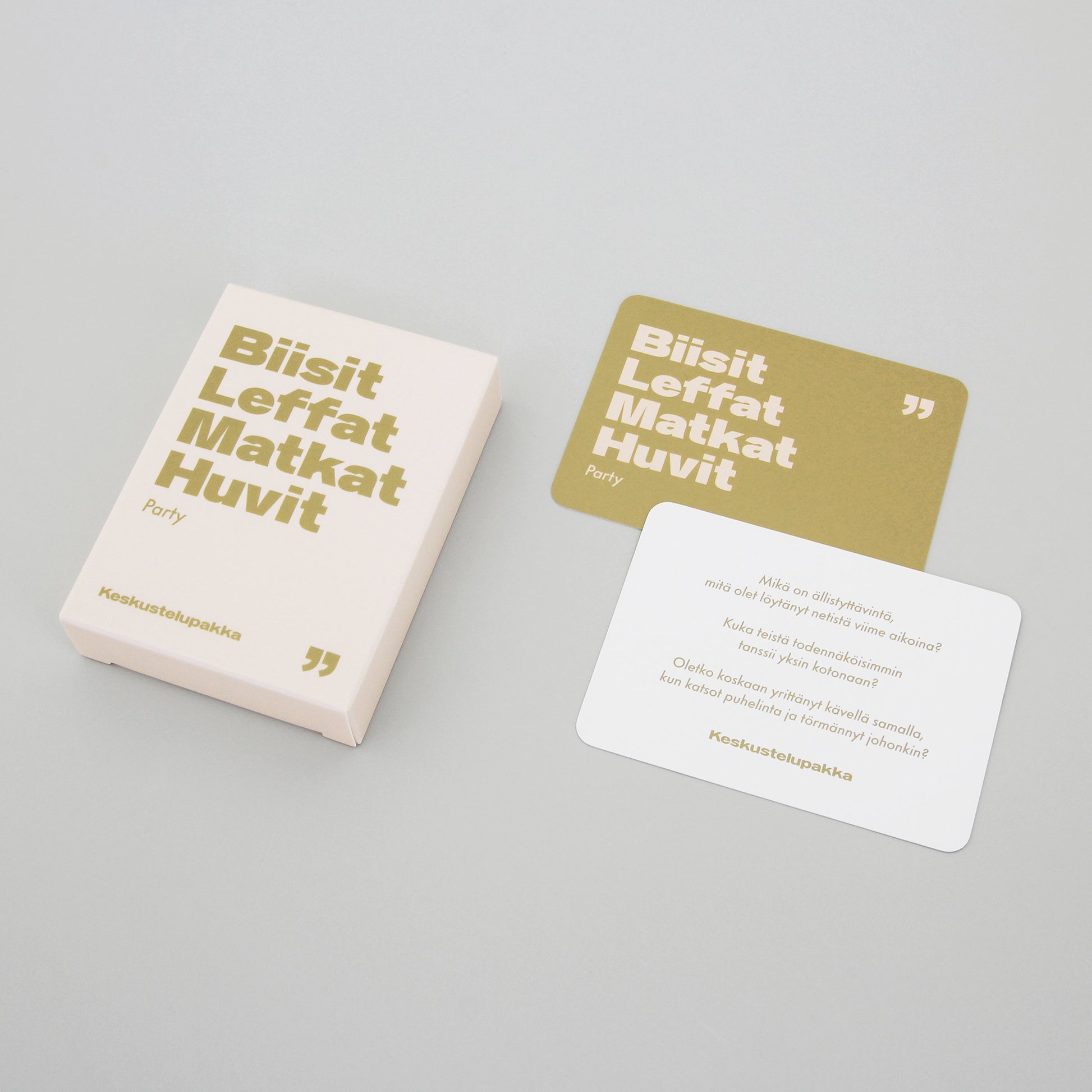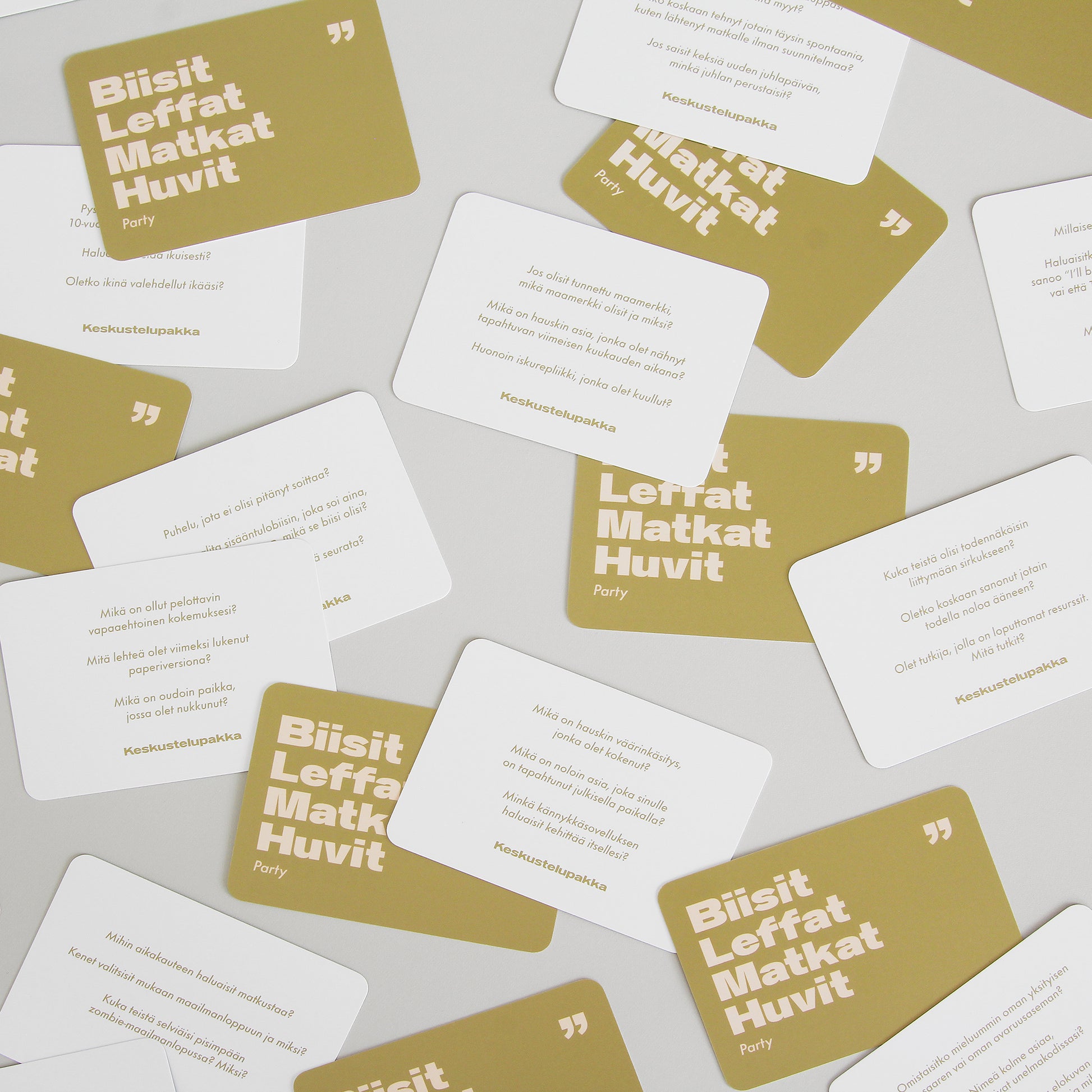 Onko tiedossa illanistujaiset, synttärit, juhlat tai treffit? Tee tapahtumasta unohtumaton! Keskustelupakka Party on täydellinen tapa murtaa jäätä, nauraa vedet silmissä ja oppia yllättäviä asioita kavereista. Tämä peli on suunniteltu keventämään tunnelmaa ja tuomaan juhliin hauskaa, rentoa ja hulvatonta keskustelua.
